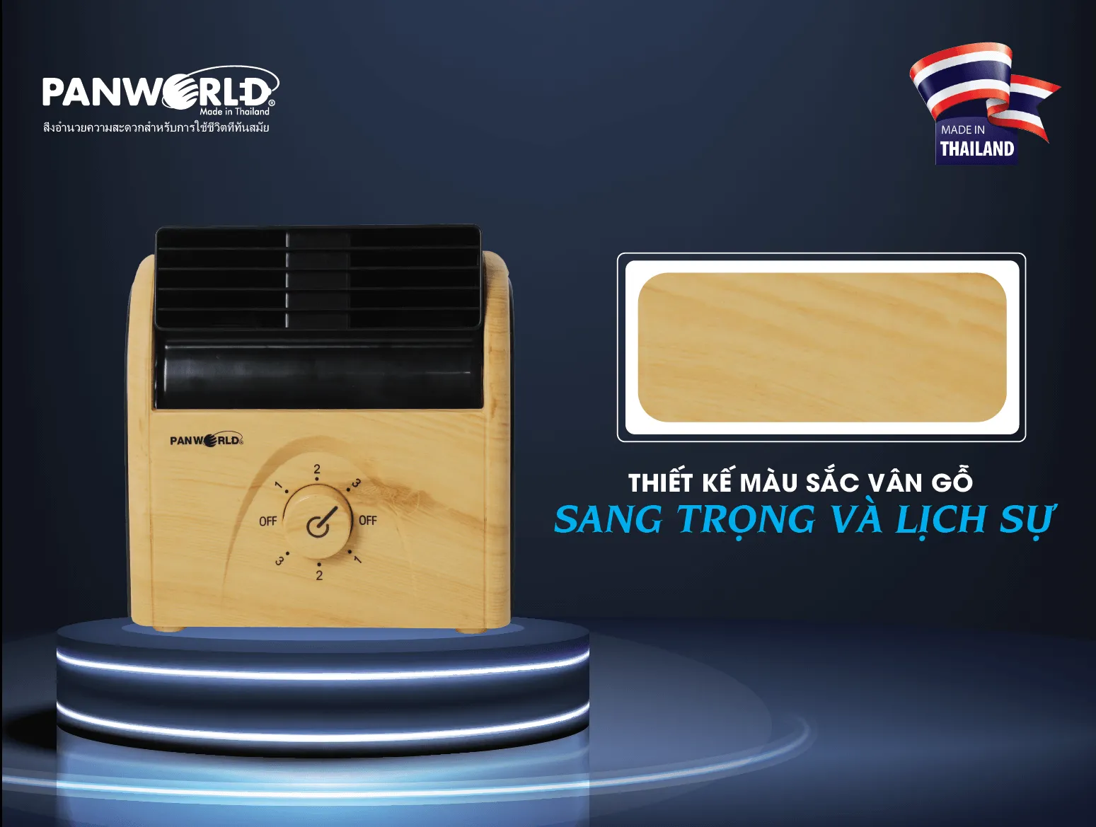 Thiết kế của quạt điện mini Panworld PW-028 là sự kết hợp nhuần nhuyễn giữa tư duy tối giản và tính ứng dụng thực tế cao. Thay vì sử dụng lớp vỏ nhựa công nghiệp đơn điệu, sản phẩm được hoàn thiện với bề mặt vân gỗ tinh xảo, tạo cảm giác sang trọng và ấm cúng cho không gian nội thất. Điều này giúp thiết bị không chỉ là một công cụ làm mát mà còn trở thành một phụ kiện trang trí cao cấp trên bàn làm việc hoặc kệ sách.